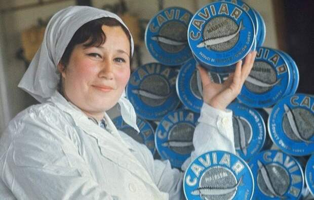 90% всей икры осетровых рыб добывалось в Каспийском море, поэтому на Западе икра считалась изысканным деликатесом в одном ряду с трюфелями и фуагрой, и стоила баснословных денег, хотя в СССР была более-менее доступна по цене (16-40 руб./кг в застойные годы). Чаще всего она продавалась в 500-граммовых жестяных банках синего цвета с осетром и надписью Caviar, правда к 80-м годам стала дефицитом и в стране Советов. Ее можно было достать либо по блату, либо в продуктовых заказах на работе.