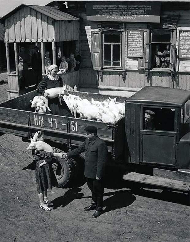 Председатель колхоза С. П. Пахомов поздравляет свинарок О. П. Урютину и Н. К. Соколову с успехами в труде и вручает премию – 30 поросят