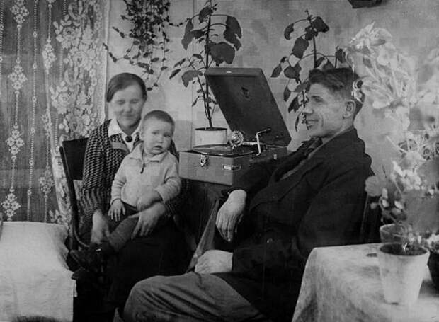Н. Бардаков и его семья слушают патефон в своей квартире