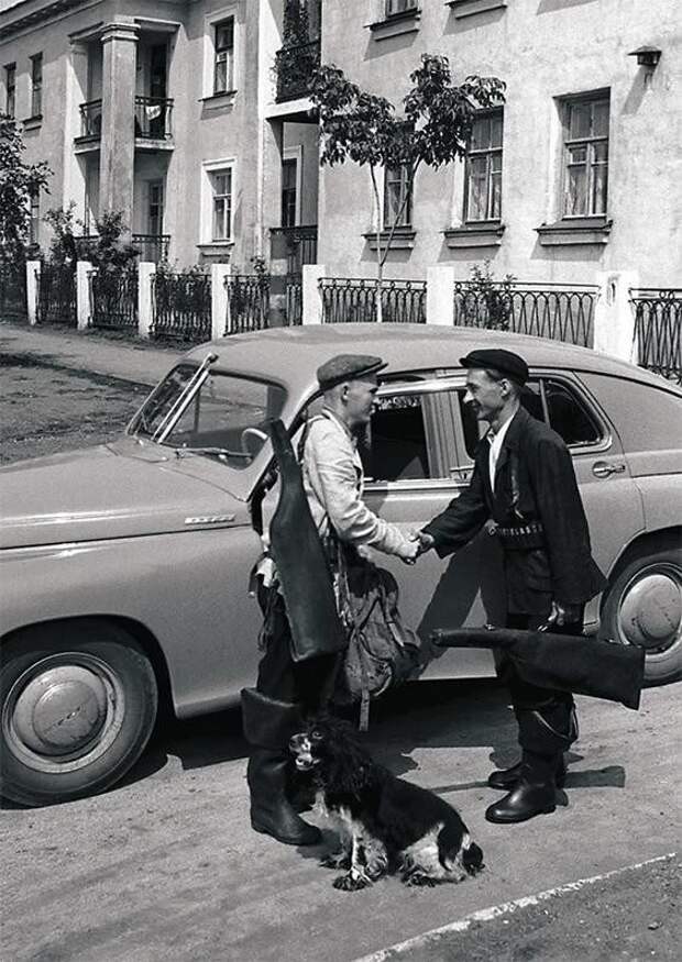 Рабочие кузнечного цеха ЧТЗ Иван Жуков (слева) и Николай Кудрявцев отправляются на охоту в воскресный день на личной машине Жукова